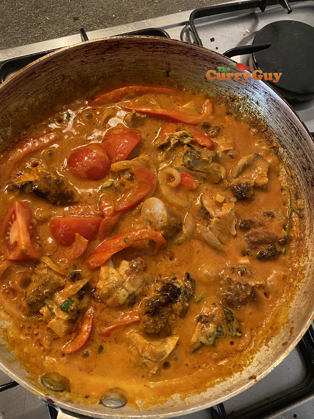- Add the chicken to the simmering sauce and stir so that it is coated with the sauce mixture. You are building this curry from the bottom up. If it is looking dry, add more base sauce. If you add too much, just cook it down until you are happy with the consistency. Ad the tomato and stir in and heath through for a minute