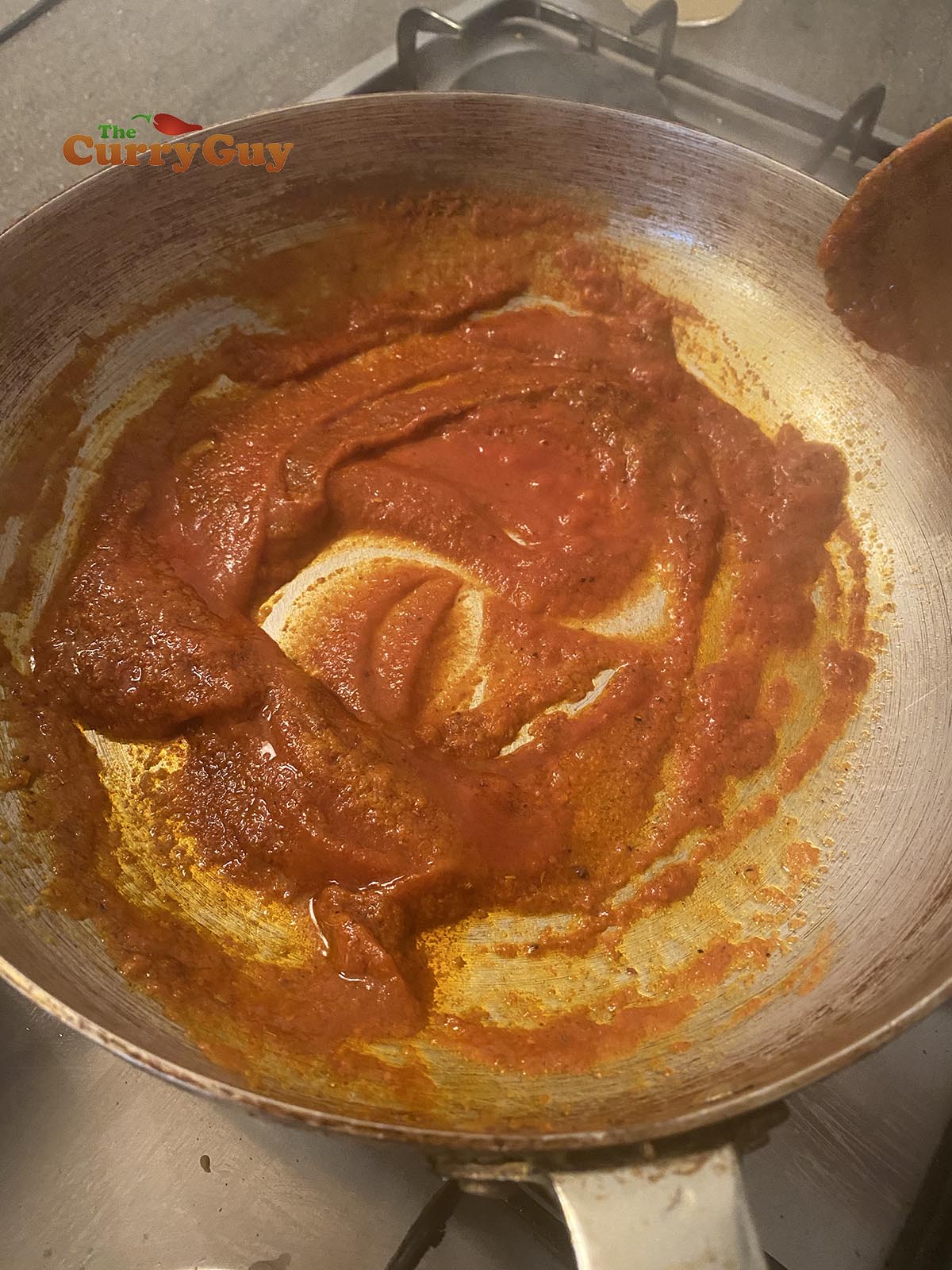 - Step 2: Add the spices and stir. Then add the tomato puree, stirring again to combine.
