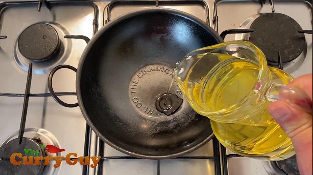 - Heat the ghee or oil in a large frying pan or balti pan over high heat.