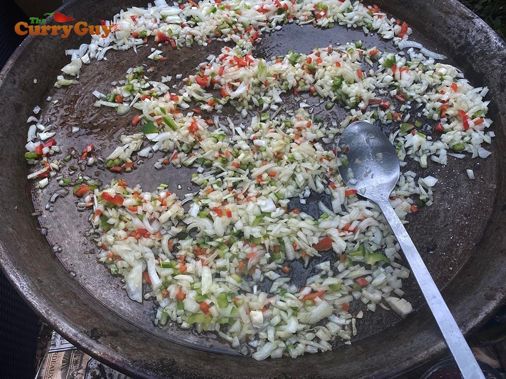 - Bring to a bubble and then stir in the chopped onions and bell peppers. Fry for about five minutes or until soft.