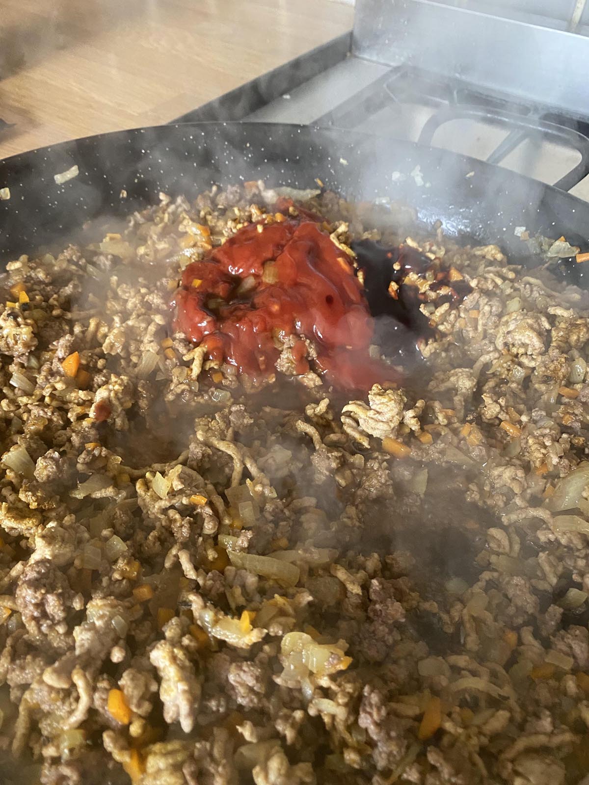 - Stir in the chopped garlic and fry for a further 30 seconds and then add the ground beef.