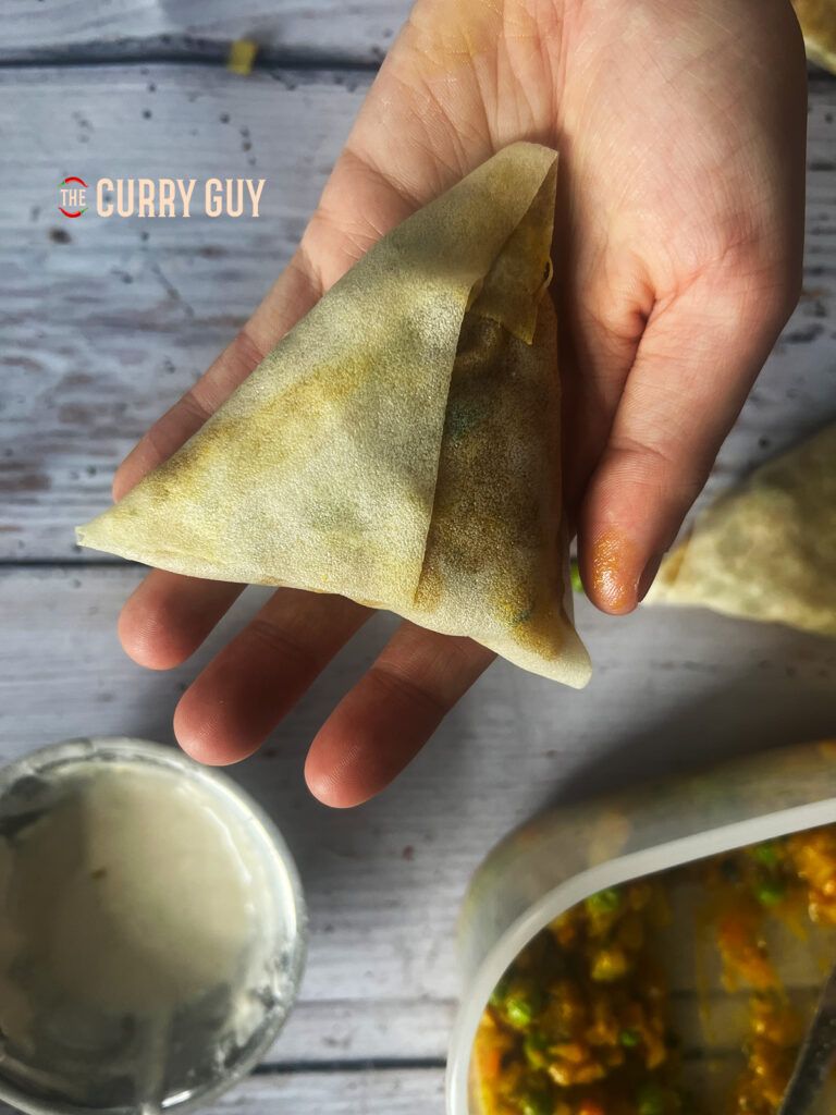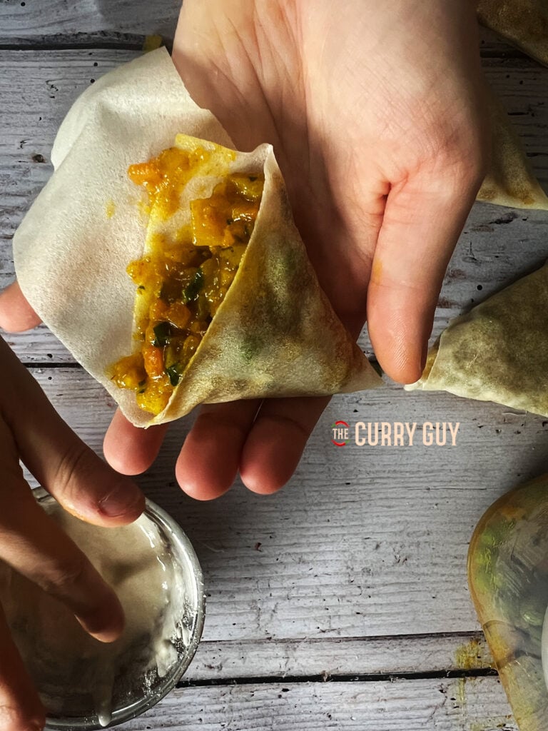 - Make sure you seal the edges of the samosas to prevent them from opening when cooking. You can do this by mixing a a paste using an equal amount of flour and water in a bowl.