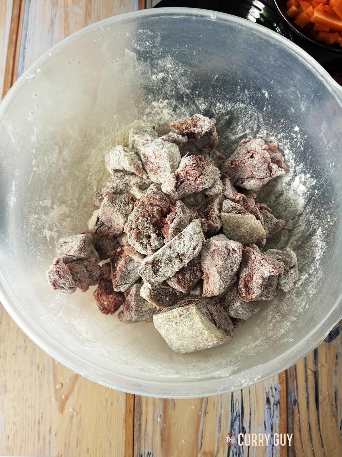 - Place the beef in a mixing bowl and pour the flour over it. Mix well with your hands so that the beef is completely coated with the flour. You can also put the beef in a plastic bag with the flour and shake to coat.
