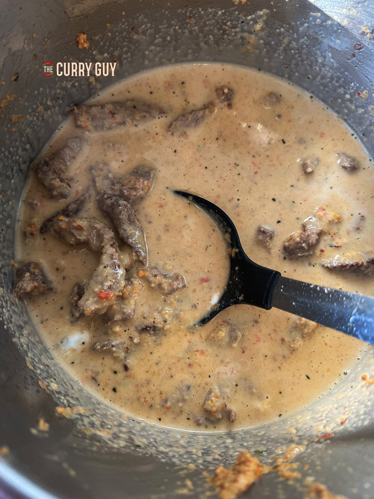 - Now Heat oil in your slow cooker (if it has a sauté function) or a pan. Sear the beef for 2 minutes until browned, possibly in batches. If skipping this step, just add the beef directly to the slow cooker but use half the coconut milk to avoid excess liquid later. Drain any liquid after searing. Add the Panang curry paste and fry for another 2 minutes, stirring.