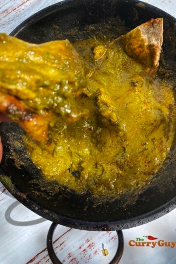 The reason for this is simple. The curry needs to be thick so that it can be mopped up with homemade naans. No cutlery required!