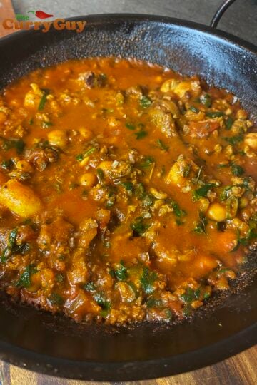 The curry comes to the tables flaming hot. You will notice that authentic Balti recipes use very little liquid.